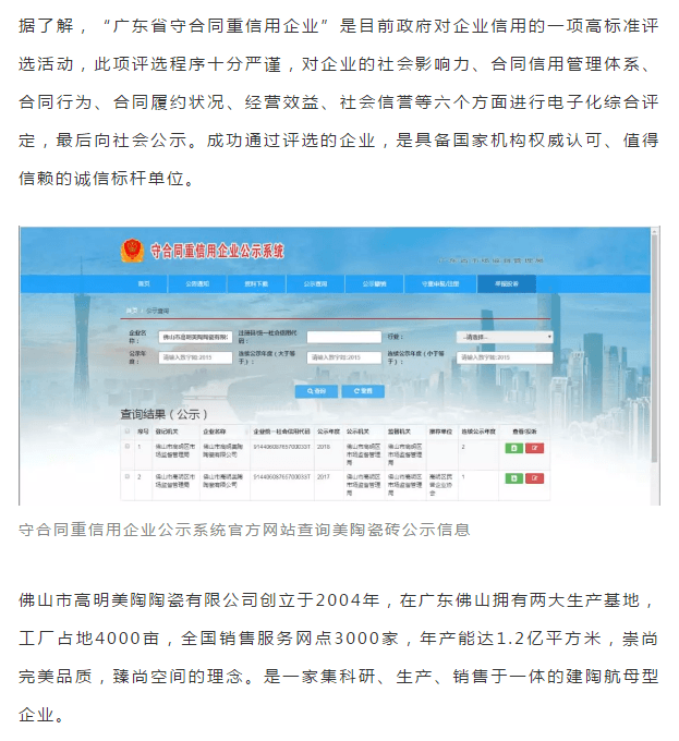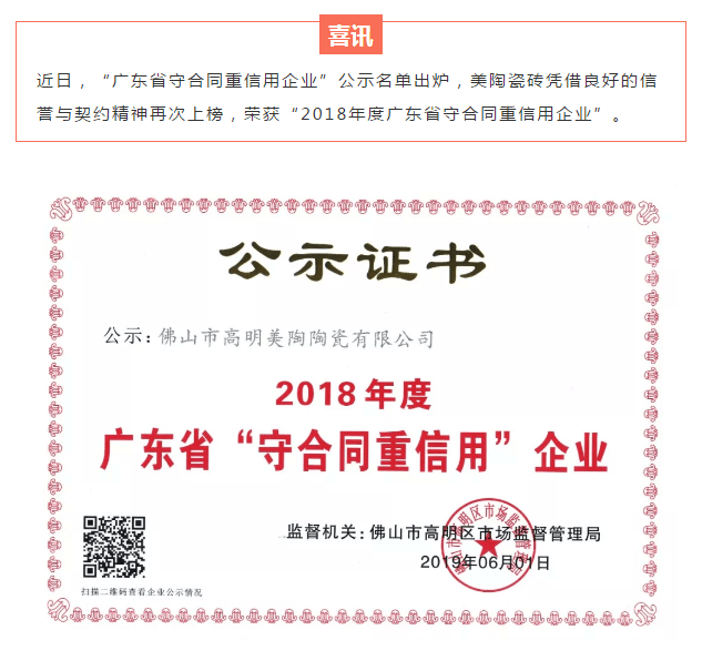 以誠信 贏贊譽丨美陶瓷磚榮獲“廣東省守合同重信用企業”